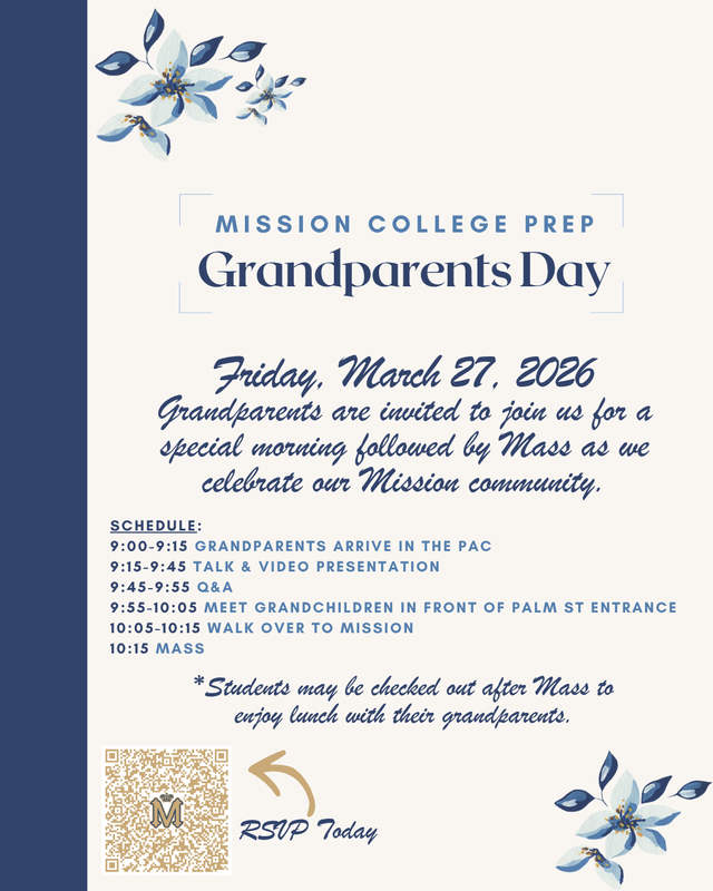 We are excited to welcome grandparents to campus this Friday for a special morning celebrating the love, faith, and traditions that make our Mission family so meaningful. Guests will enjoy a warm gathering, time with their grandchildren, and a beautiful Mass together. It is a wonderful opportunity to honor the important role grandparents play in the lives of our students. We look forward to sharing this memorable day with you.