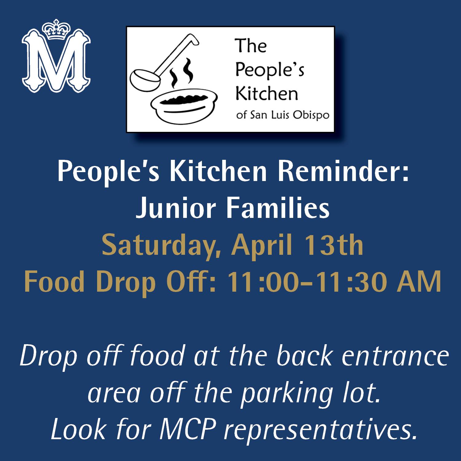 Junior families, please drop off your People's Kitchen item on Saturday, April 13th. An email has been sent with instructions or click the link to view the list. Thank you for helping those in need in our community.
